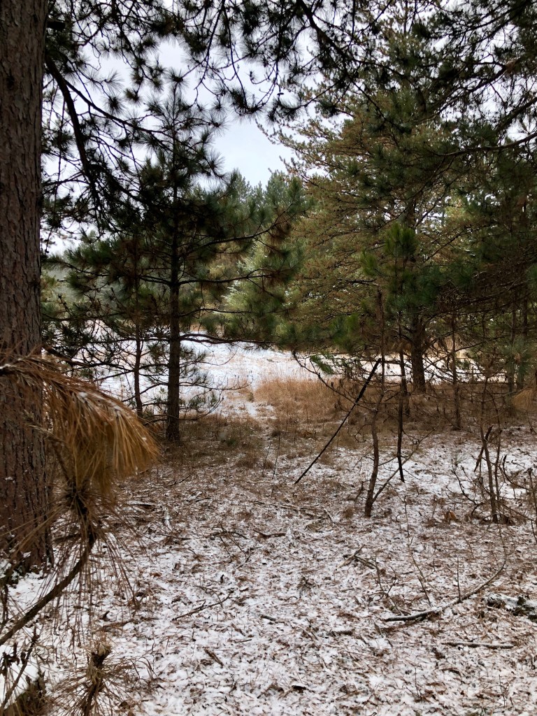 Again no grouse, and no squirrels. I heard some chickadees chicka-dee-dee-deeing, but the forest was silent otherwise. I enjoy walking through piney woods, probably more than any other type of woodland. The forest floor is covered with pine needles that soften my footsteps, and the lack of brushy undergrowth make the going easy. It was a good opportunity to practice my slow stalk; walking slowly, less than a mile per hour, in order to sneak up on potential game. I’ve often flushed grouse along the edges of these types of forests where young pines offer them some cover.
