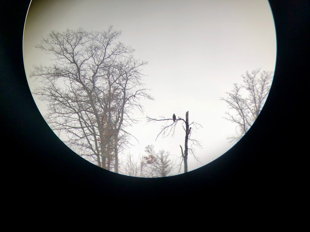 After spending a half-hour exploring the pine grove, I worked my way north along East Refuge Road. If you visit Crex in the winter months, East Refuge is good to check out, because there are nearly always hawks and eagles perched in the trees along the road. Today I saw an eagle, although it was pretty far away so I could not positively identify it even with my binoculars. It was a dark eagle with little to no white on it at all. It could have been a Golden Eagle instead of the usual immature Bald Eagle, but I cannot be sure. Here is why I wish I would have brought my long lens! I did snap some photos with my 18-270 zoom but I doubt they will help much. I also thought of trying a shot with my iPhone through a binocular lens, but when I tried to zoom in the bird took off and flew away. I think I need to spend some time working on this technique.