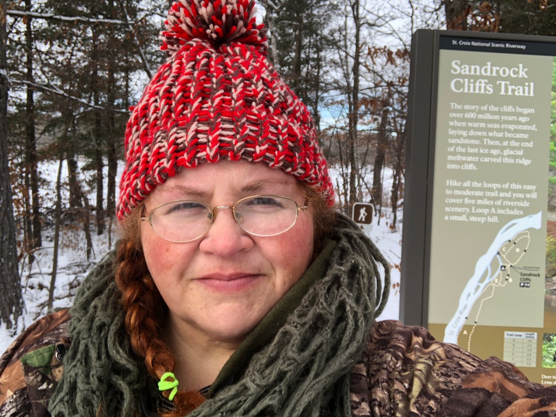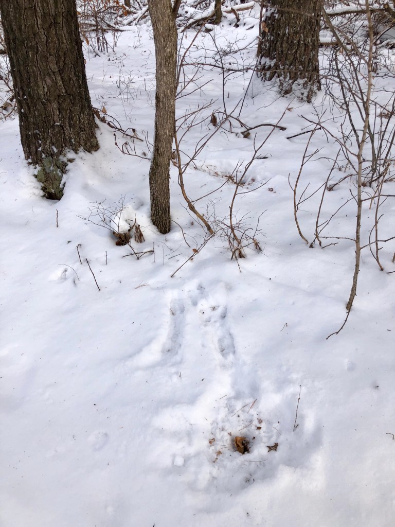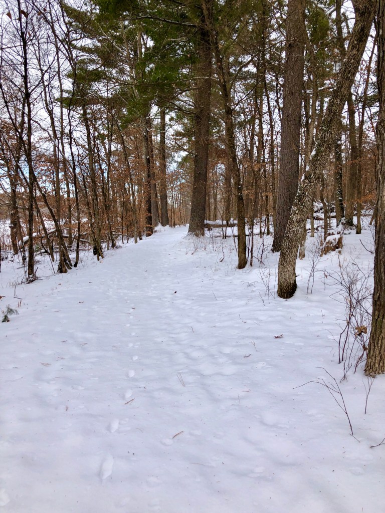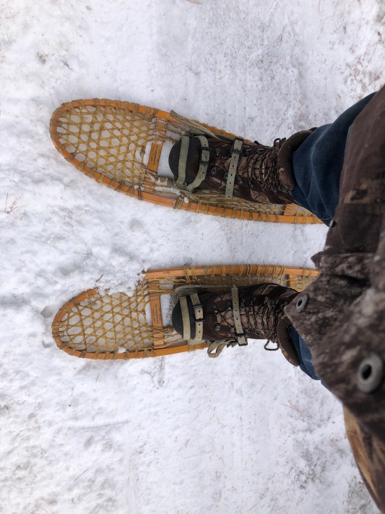 I had to drive over into MN this afternoon and decided to stop at the Sandrock Cliffs hiking trail on my way to do a little snowshoeing. I had to adjust the bindings some after my first adventure with my new snowshoes the other day, and I think I have it figured out now. I cheated and strapped my boots onto the snowshoes at home so all I needed to do was slip my feet into the boots, tighten and tie them, and buckle the top strap over the center of my foot. It worked quite well! Although I’m afraid that if I had to strap the shoes on out in the field with the boots already on my feet it would take a lot more time!