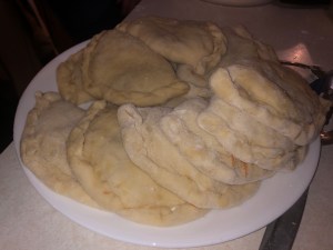 Divide dough into 16 pieces. Roll each piece into a ball; should be about the size of a small to medium egg. Roll each ball out one by one as thin as you can without tearing- should be about 6 inches in diameter. Make sure there are no holes. Place a spoonful (about 1/3 cup-ish) of meat mixture on 1/2 of dough near center. Fold dough over meat mixture. Press edges together, then roll edges up and press to seal (this is pretty important- when you fry you don’t want the hamburger grease to leak out into the frying oil). Place on a platter and repeat until all the pies are formed.