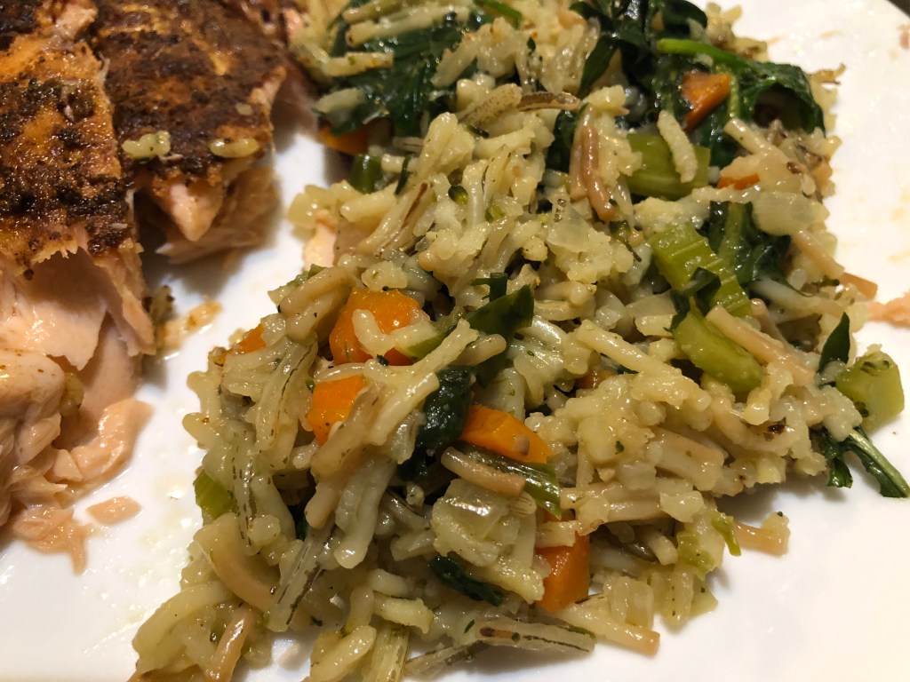 I love rice, and I enjoy making pilafs with various veggies and spices. One shortcut I often deploy is to start with rice-a-roni and jazz it up by adding my hand-harvested wild rice and whatever vegetables I have on hand. The main course tonight was grilled salmon and I was in charge of a side dish, so I made a pilaf chock full of vitamins and minerals from the wild rice, dandelion greens, ramps and spinach.