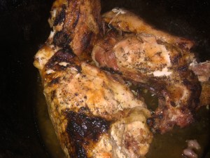 While chicken is browning, place your cast iron dutch oven on the cooler side of the grill and put in a 1/2 cup of water and a 1/2 stick or 4 Tbsp olive oil. Place chicken pieces, skin side up, into the dutch oven with breasts on bottom. Cover and then place grill cover on. Cook for 20 minutes. Test for doneness using thermometer.