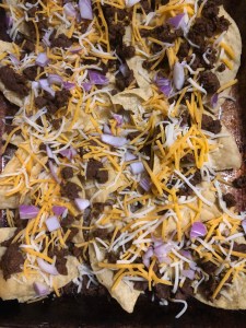 Nachos are very simple yet so delicious, one of my favorite foods. Simply place some tortilla chips onto a pan, sprinkle on some of the taco meat, cheese and onion, and bake for a few minutes in the oven until the cheese is melted. Then arrange the chips onto a plate and top with lettuce, salsa, black olives, etc. The last step is to eat them and enjoy!