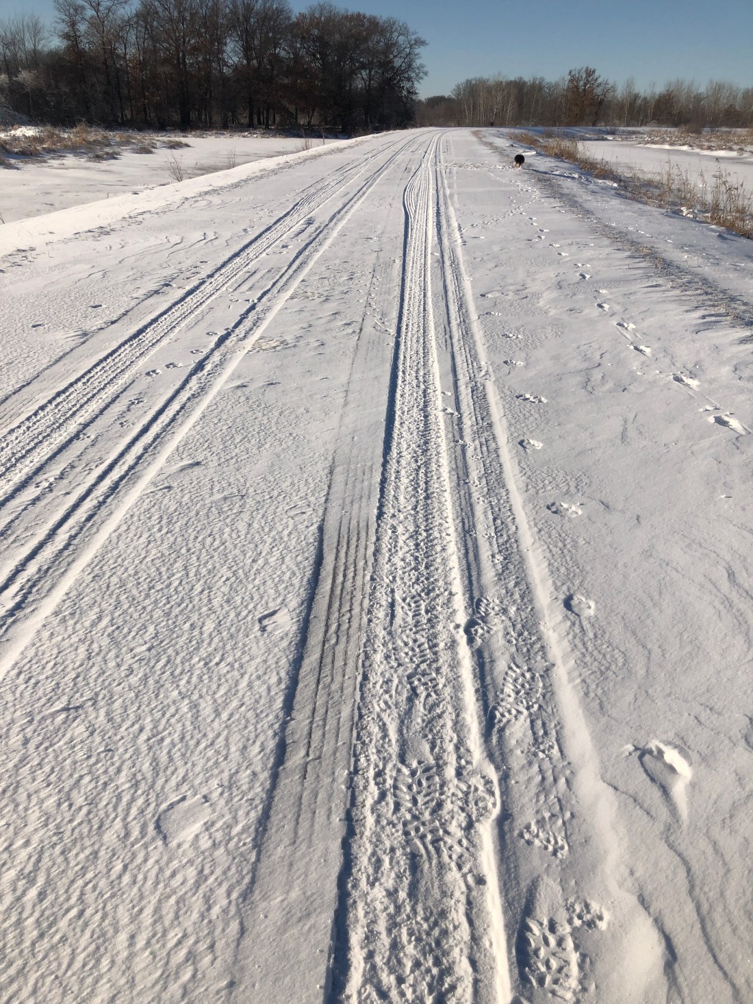 The wolf tracks, on the left, headed west along the road. Annies little tracks are next to them on the right.