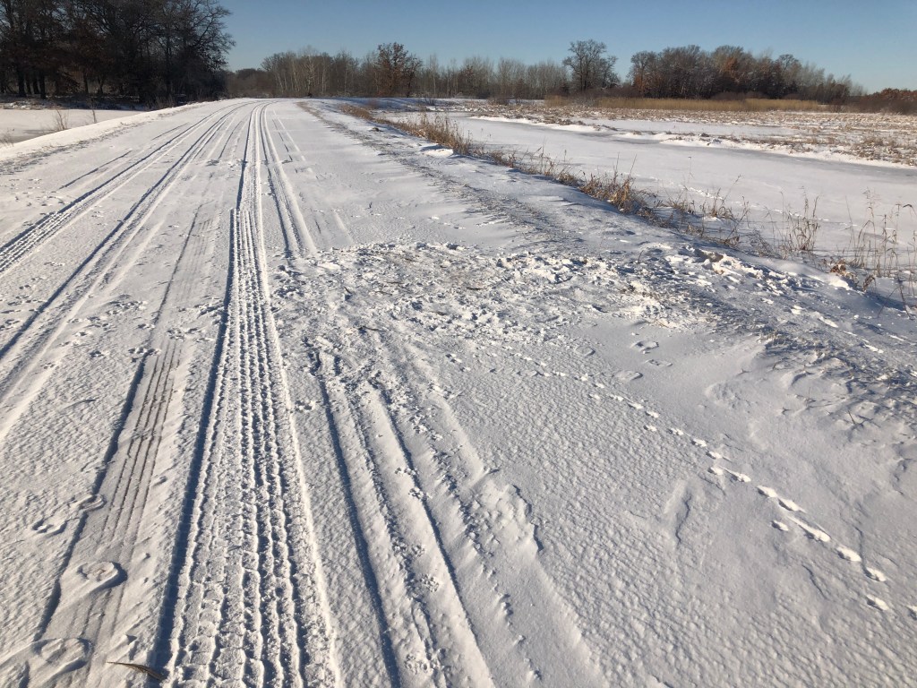 It was a beautiful sunny day today, perfect for a winter walk. The snow is too deep for my short-legged companion Annie to accompany me on an off-road snowshoe hike, so I took advantage of the marvelous gravel roadways on Crex Meadows, not far from home and blessedly unplowed after the latest 3-4 inch snowfall the other day. It was just enough snow for animal tracks but not too much for an easy walk for both of us.