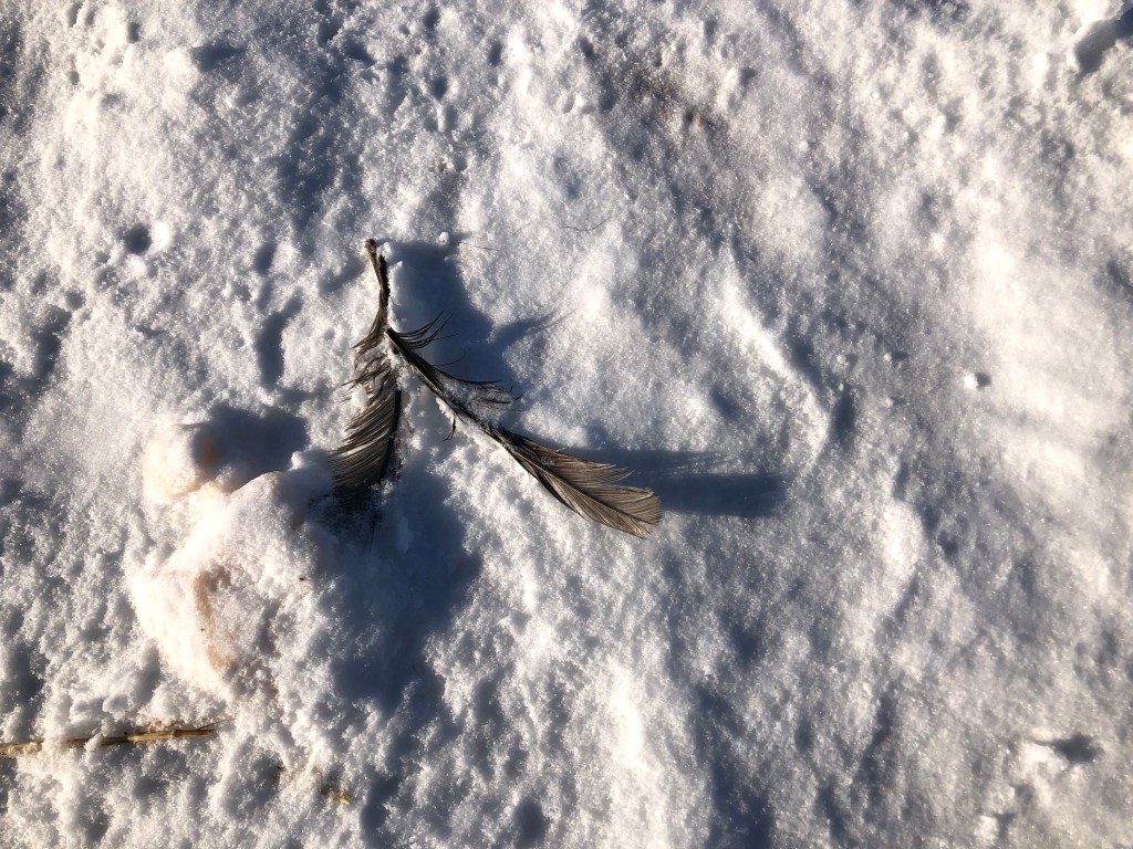 Upon closer examination, it appears that the wolves had a tussle over a bird, perhaps caught by one of them, perhaps already dead. All that was left were a few feathers. I think it may have been a Canada goose but I do not know for sure.