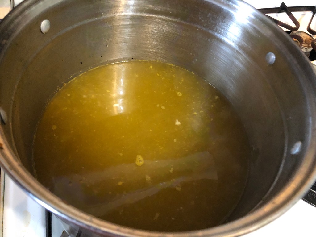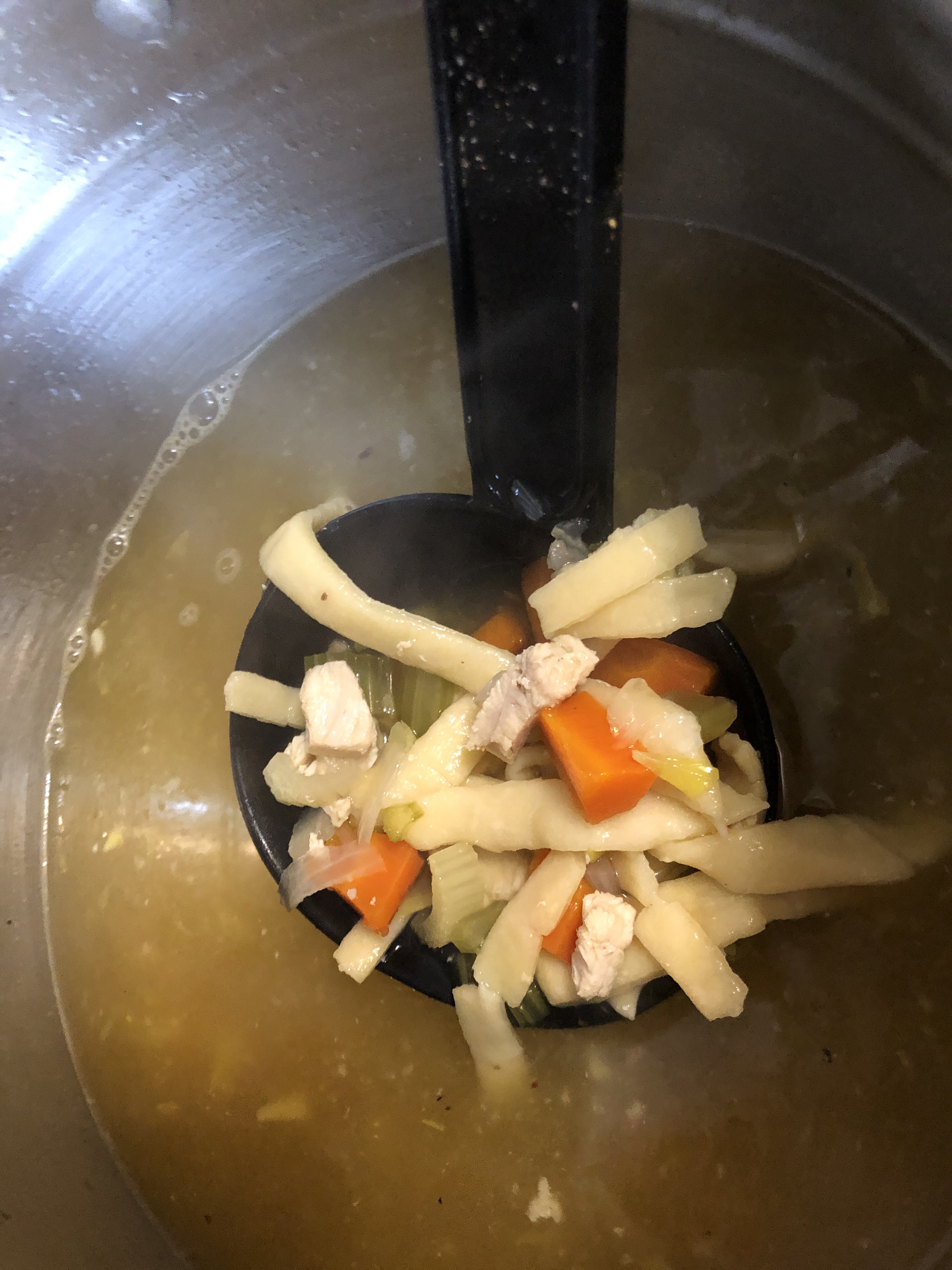 Cut 1 large or 2 small chicken breasts into small pieces and sear in the bottom of a large stock pot. Add 2 cups of chicken broth (I prefer Swanson’s brand) and bring to boil. Cut 1 medium onion, 3 stalks celery, and three medium to large carrots into bite-sized pieces (as desired) and add to pot. Add 6 more cups chicken and/ or vegetable broth, 1 tsp salt, 1 tap black pepper and a pinch each of celery salt, ground mustard and garlic powder to pot.