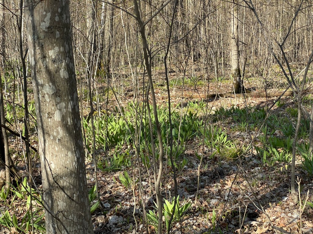 Ramps are spring ephemeral plants, growing only in the springtime before the forest canopy leafs out to shade the ground. When it gets too warm, by mid-May, the leaves wither and die back. So we have just two or three weeks to harvest them. Ramps are also called wild leeks, and have a delicious oniony-garlicky flavor and aroma, which helps to distinguish them from other similar but non-edible plants. Their broad green leaves as well as the white base are edible.