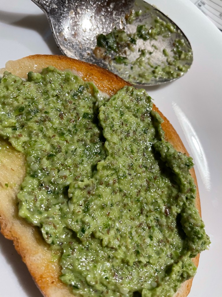 I enjoy eating ramps raw in salads, or sauteed into a stir fry or mixed with wild rice. This year since I had plenty, I chopped some and dried the bits in my food dehydrator and also hung some up to dry whole so that I can enjoy their unique flavor in the fall and winter. I turned some into a delicious wild leek pesto too, which was an especially tasty way to enjoy the ramps. Pesto is easy to make: just use a food processor to chop and blend the ramps, nuts (pine nuts are the conventionally used, but you can use walnuts, sunflower seeds, even flax seeds, which is what I used), parmesan cheese, olive oil, and salt and pepper. I added a little extra garlic too, but that is not necessary.