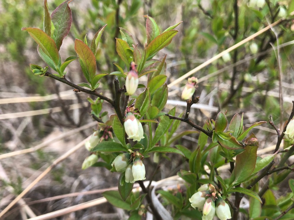 Vaccinium angustifolium – Lowbush blueberry, is native to Wisconsin and thrives in the sandy acidic soils found in this area. It is in the Heath family Ericaceae, and is related to to wintergreen, cranberry, lingonberry, and azaleas, among others. Its flowers are urn-shaped and the leaves are somewhat evergreen. They are found near oaks in this region, and have been historically prolific here because wildfires would keep the landscape open, creating pine and oak barrens, allowing the blueberry plants to get more sunlight and produce more abundant and larger berries. Bears are well known for feasting on berries, but many other critters rely on them as well, including deer, chipmunks, and many species of birds.